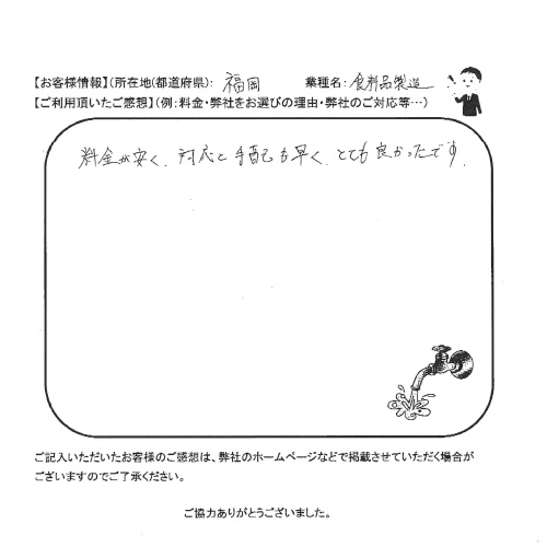 ・料金が他の会社に比べて安く、満足です。引き続き依頼をお願いする予定です。